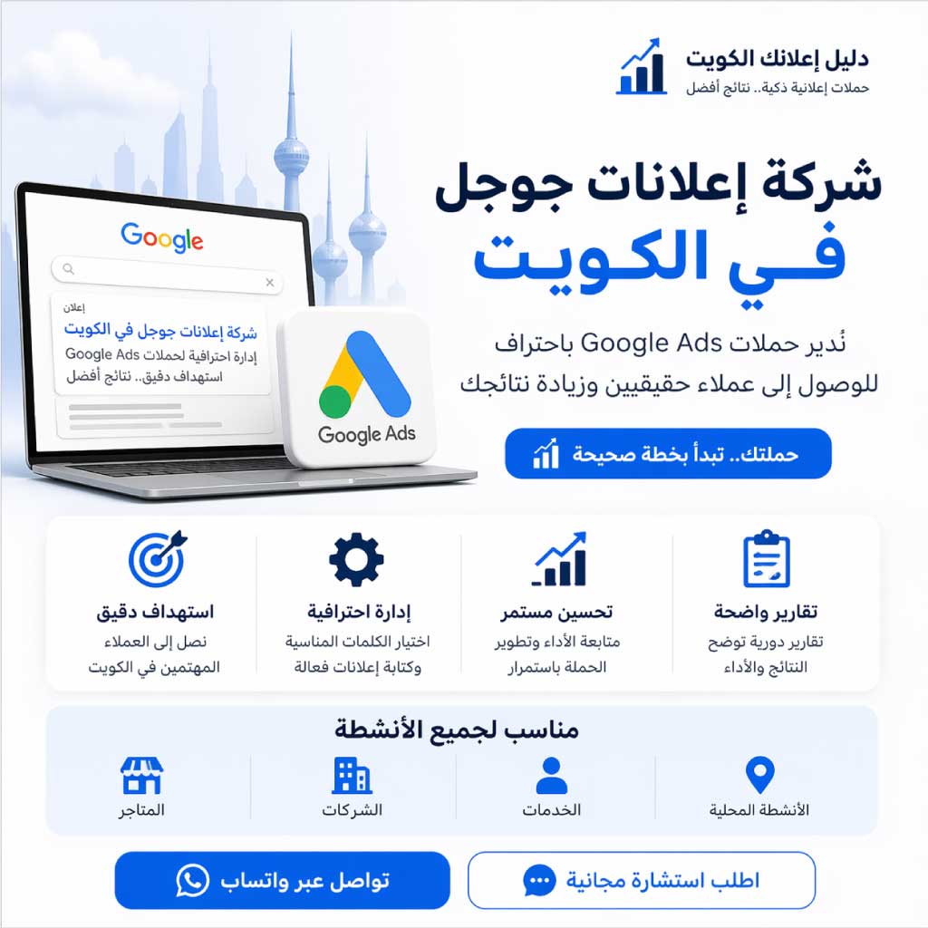 إذا كنت تبحث عن شركة إعلانات جوجل في الكويت أو خبير إعلانات جوجل أو وكالة جوجل أدز تساعدك على إدارة حملتك بصورة أوضح وأكثر احترافية، فإن دليل إعلانك الكويت جاهزة للعمل معك بخطة مناسبة لنشاطك، ورسائل إعلانية أقوى، واستهداف أدق، ومتابعة مستمرة تساعد على تحسين النتائج.
